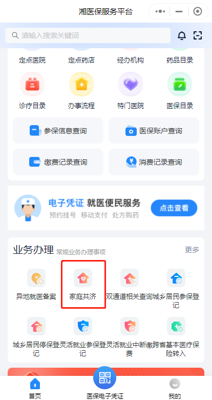 第一步:下載“湘醫(yī)保”App,或進(jìn)入“湘醫(yī)?!盇pp小程序,登錄后在首頁“業(yè)務(wù)辦理”中找到“家庭共濟(jì)”,點(diǎn)擊“共濟(jì)申請”。